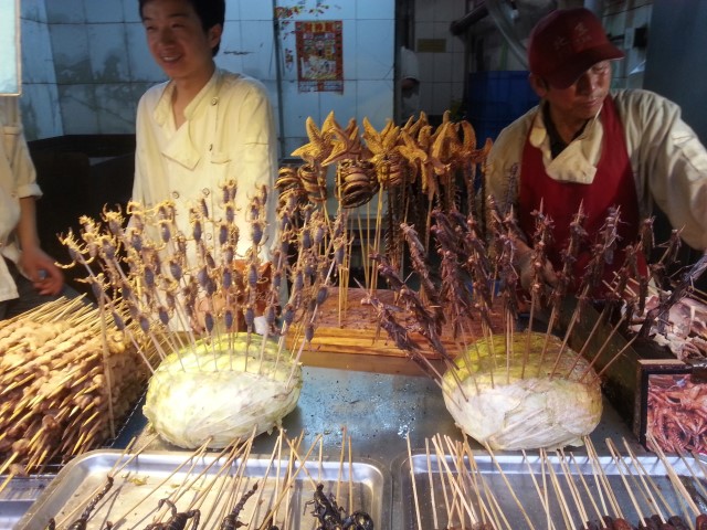 It's mostly in English, but if you ever do this make sure they turn it on in the shop and set up the language for you. On our way back, Galaxy Tablet in hand, we meandered into a very Chinese looking alleyway off the main shopping street. Primarily a food market, they sold, among other local delights, little live scorpions on sticks. Do you boil them first, you ask? Nope. You just eat them. Seeing them saved us the pesky hassle of wanting to eat for the rest of the trip.