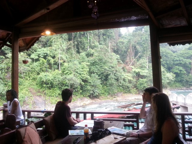 It was a day for facing fears, because our next task was to tube (white water raft) back down the river to the village. I reminded Andre that I couldn't swim, but he reassured me that it was perfectly safe. The raft was four large inner tubes roped together. For safety, you hang on to the person in front of you. They have a somewhat more relaxed attitude in Bukit Lawang. It was awfully good fun though, I have to admit.