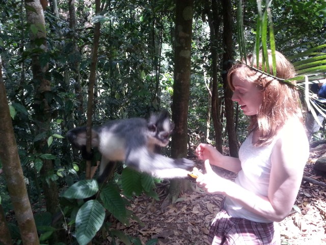 Onwards we went further into the jungle, and came across some Tomas monkeys. These are small, extremely tame furry monkeys who you can touch and feed. Some guides had brought fruit for us to share with the monkeys (I ate most of the fruit) and Andre made us a jungle hat. I sat for a moment, to reflect on the monkeys and delicious passion fruits, and put my hand on the ledge beside me. It was completely rotted through and, like a scene from The Mummy, hundreds of ants immediately spilled out and went all over my arm. I was promptly bitten on the hand and the sting caused me to cry out like an absolute baby. But you try tell me that getting bitten in the Sumatran jungle by an exotic insect won't make you forsee your inevitable death hours later. Andre whipped up some dockleaf juice, applied it, and the pain vanished. The stupid bite only left two tiny red dots so everyone thought I was overreacting.