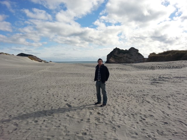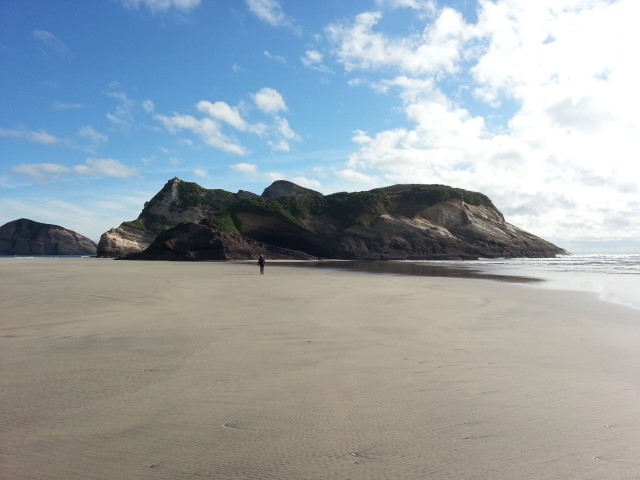 Eventually we got to Wharariki beach. We pulled into the carpark, avoiding the inexplicable peacocks and horses wandering around, and began the arduous twenty minute trek across hills and sand, to find this waiting for us: