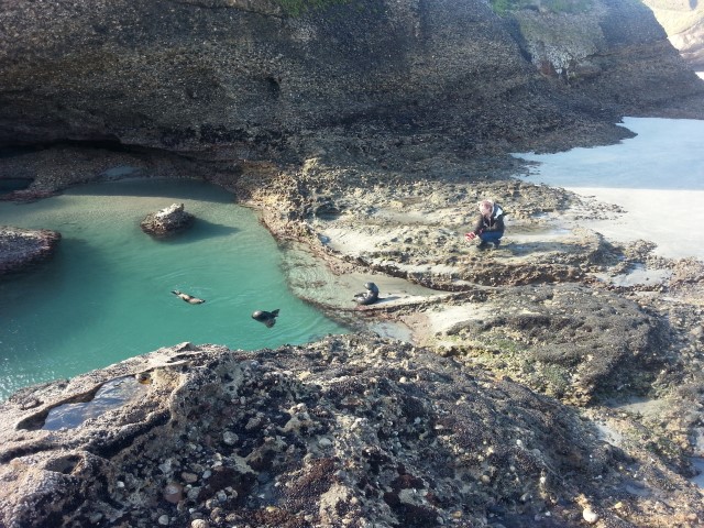 In the two hours we were there, we probably saw a total of ten other people. The weather was cold, I grant you, but it was the winter holidays and it's so beautiful. I couldn't understand. Was there a shark warning I was unaware of? We didn't see any sharks. Just... BABY SEALS. My uncle had told me that if you're patient and stand near them on the beach, sometimes they'll come up out of the little pools and play with your feet. We got locked in a battle of wills with the one other couple on the beach, each wishing the other would just get bored and move off because the seals were never going to approach with that annoying other couple there. They won, mainly because we knew we had to get the van back before dark.
