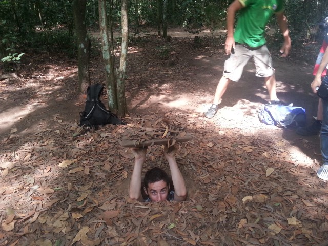 Bleak history did not finish there. Our second day was a trip to the Cu Chi tunnels by boat along the river. These were tunnels that the Viet Cong used to hide from, and generally outwit the Americans. The tunnels were miniscule. To give tourists an idea, they actually had to be widened because we'd never fit in them, being so big and fat by comparison. One part of the tour let you walk through for 50 metres, though you could leave each 10 metres if you couldn't hack it. I couldn't. Even widened it was horribly claustrophobic. I lasted 10 metres. Dan did the 50 and he's about 11 foot tall.