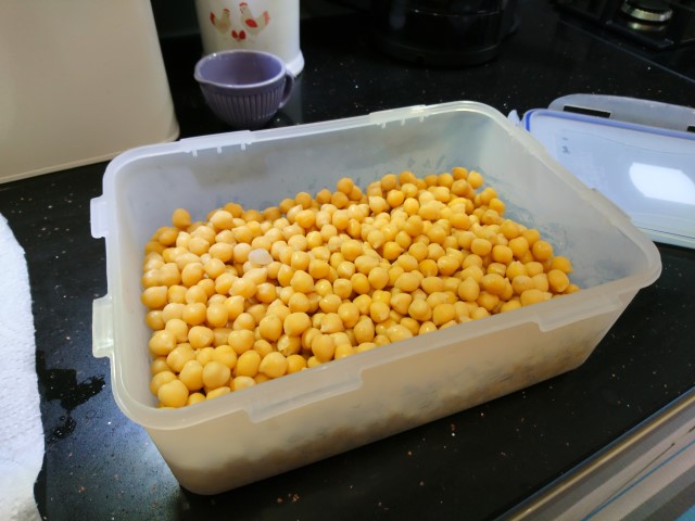 Now the remaining chickpeas have been lovingly poured into tupperware where they may sit in the fridge for about 6 weeks, until we finally give in and throw them away. The tupperware box is massive, to accommodate this ridiculous quantity of chickpeas, so we're going to have forgo some other stuff. Like milk and butter, and that half an onion perpetually wrapped in clingfilm.