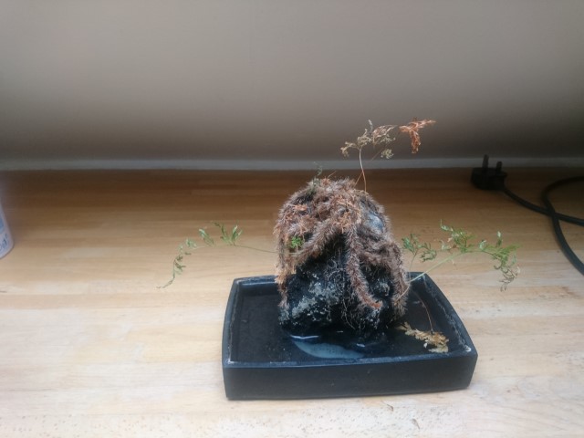 We got this rock fern. It's a lump of rock with a fern growing on it, and you keep water in the base, as if it's in a river. 'LOW MAINTENANCE' was written on the label. You just keep water in its tray and it'll thrive.